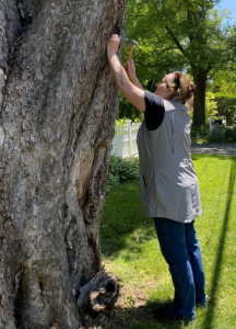 The process is straightforward. We reach out to property owners requesting permission to access their property to verify the status of the tree. A team of three volunteers locates each tree and takes measurements to determine the diameter of its trunk, the spread of its crown, and its overall height. Each of these measurements contributes to an overall rating as established by American Forestry Association. This information is provided to the CT College Arboretum in order to update the Greenwich listing. Among our town’s Notable Trees are Oaks, Horse Chestnuts, American Sycamores, London Planetrees and Japanese Zelkovas.