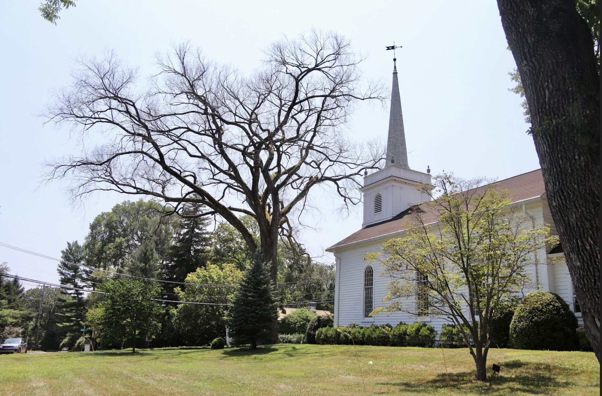 A majestic Elm Tree on the grounds of First Church of Round Hill Road in Greenwich has sadly died and must be removed. The tree, which stands prominently on the corner Round Hill Road and John Street, is a source of peace and tranquility in back country.