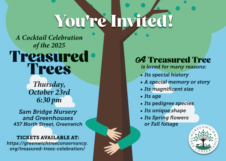 Greenwich residents’ love for their trees will be on full display Thursday, October 23rd at 6:30pm at Sam Bridge Nursery and Greenhouses. Come join us for the Treasured Trees celebratory reception!
