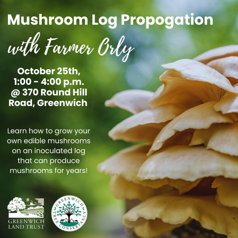 Greenwich Tree Conservancy and Greenwich Land Trust invite you to learn how to cultivate your own delicious, edible mushrooms. In this hands-on workshop, Farmer Orly will show how to grow mushrooms by inoculating a hardwood log, inserting mycelium spawn—the living network of fungal threads that will produce mushrooms—and sealing it with wax to protect it. Program fee covers all the necessary materials and registrants will go home with